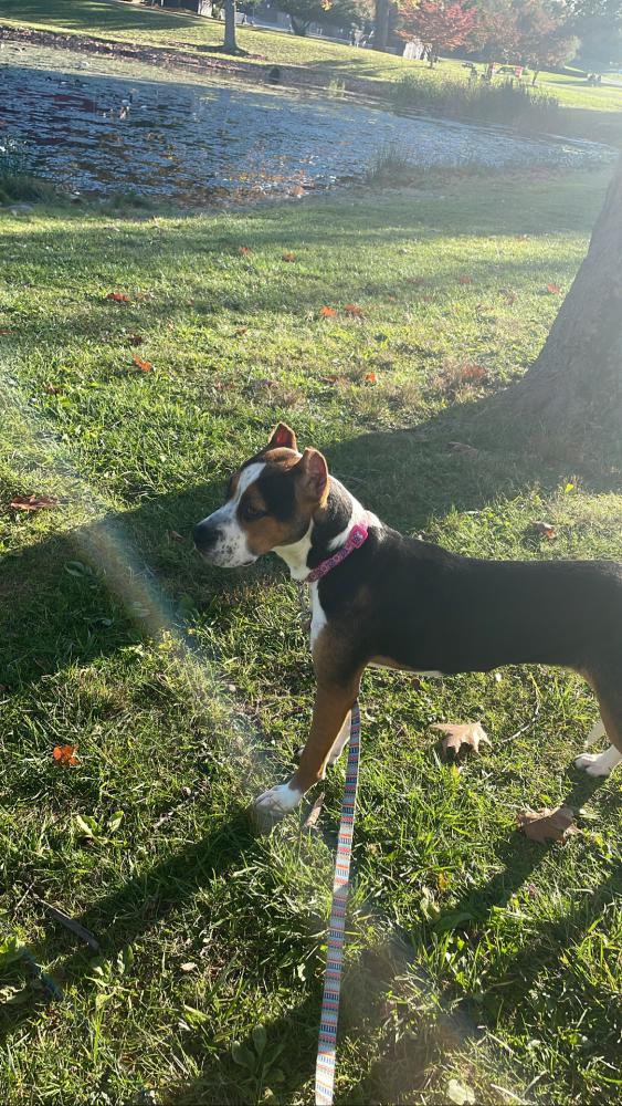 Pet Description:brown and white Pitty. She’s about 35lbs. Answers to Trixie. Shes a very timid dog, will hide. She has a mole above her eye with a hair growing out of it. |