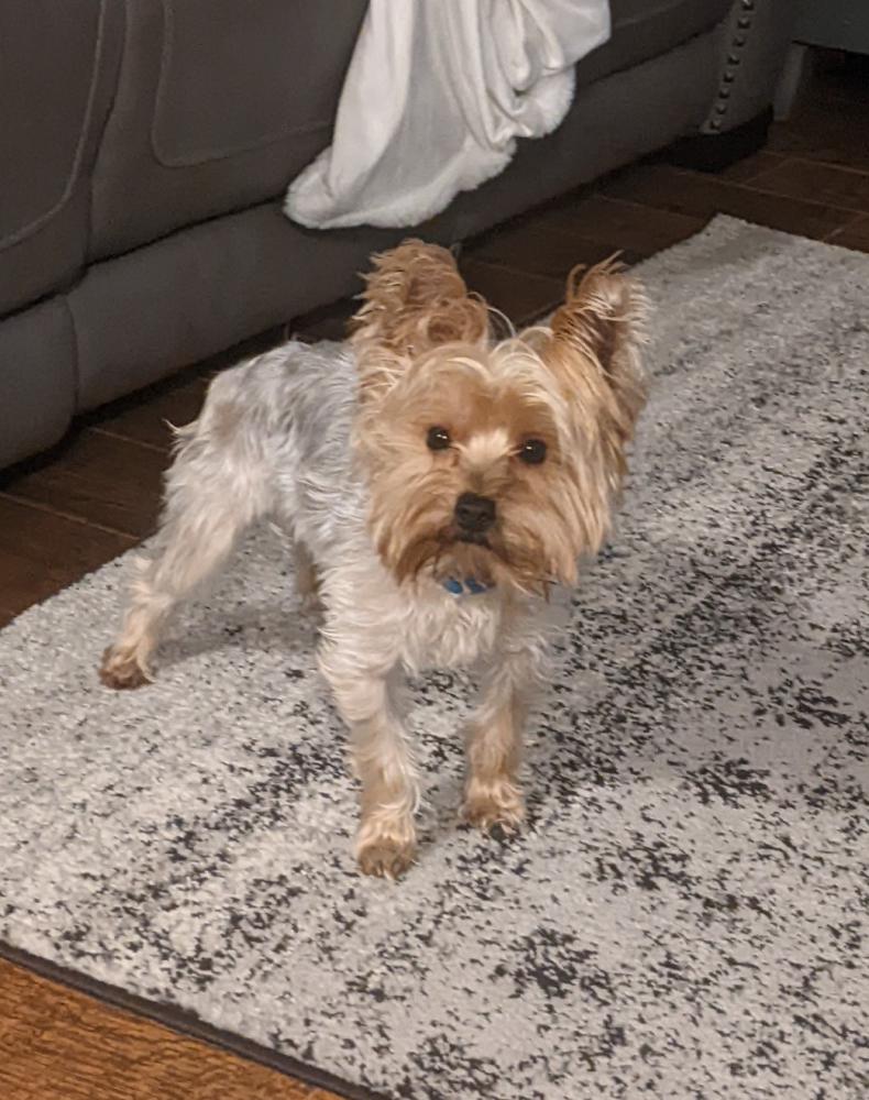 Pet Description:Rocky is a small Yorkie wearing a blue collar |