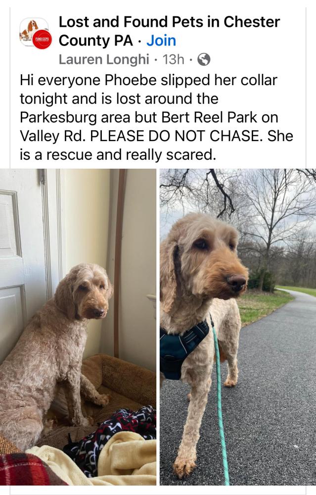 Pet Description:Phoebe is a 65 pound golden doodle. She is very scared and timid. Do not chase her and do not directly approach her. |
