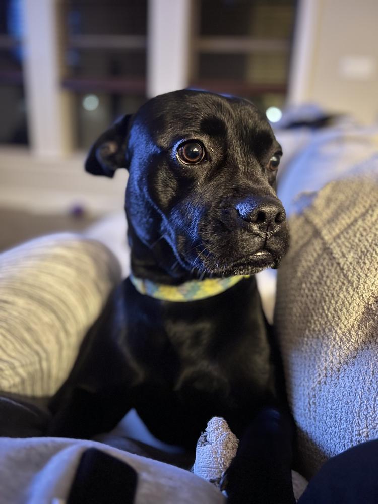 Pet Description:He is a black lab mixed with French bull dog. He is about 40lbsBrown eyes |