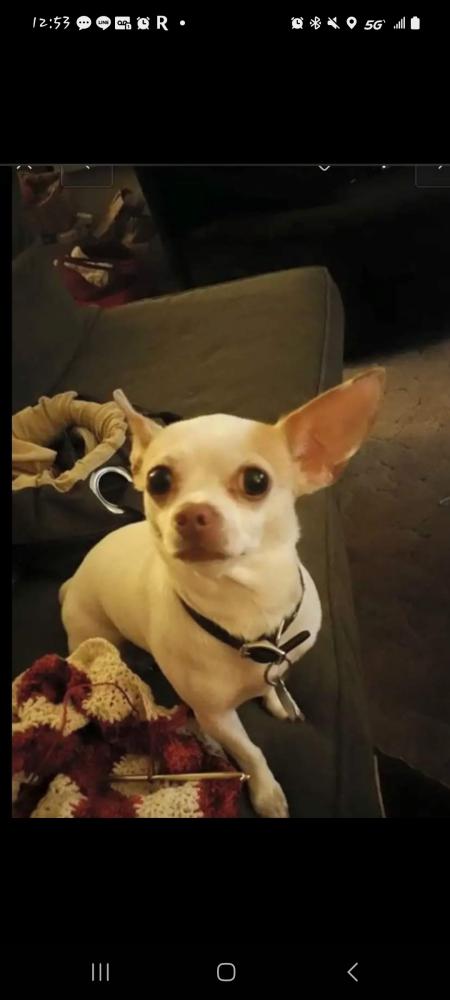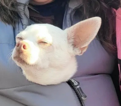 Pet Description:13 year old All white slightly overweight chihuahua, pink nose, and has a lump in groin area (diagnosed hernia). |