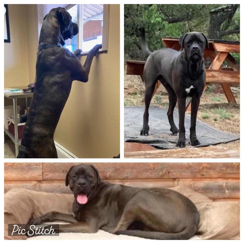 Pet Description:Tall dark chocolate, 125 lb, mixed breed that looks like Cane Corso or Great Dane. No collar but is chipped. He’s goofy and doesn’t know his size, but he’s friendly. |
