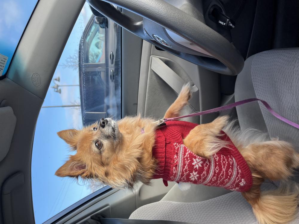 Pet Description:Long haired chihuahua, golden hair, wearing a pink/ purple thin collar with a flower design |