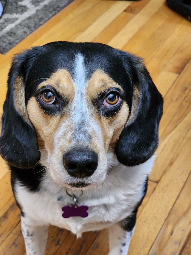 Pet Description:She’s a beagle mix about 5 years old mostly black and white with light brown coloring she’s skiddish probably very scared escaped out of patio door 4/15/24 10pm-10:30pm |