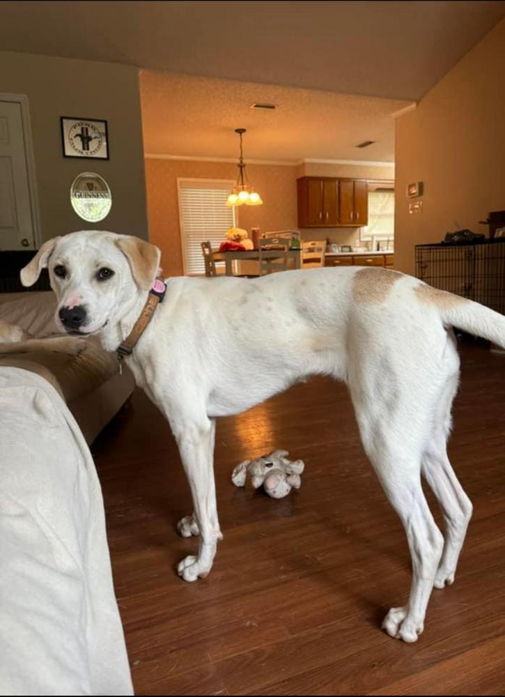 Pet Description:Large white with small patches of brown. Sweet loves people. Looks like a mix of Great Dane and Lab |