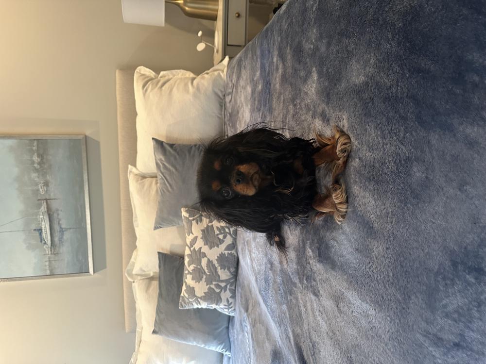 Pet Description:Small 10 pound 2 year old Cavalier with black body and brown face and paws. She has long ears and brown eyes. |