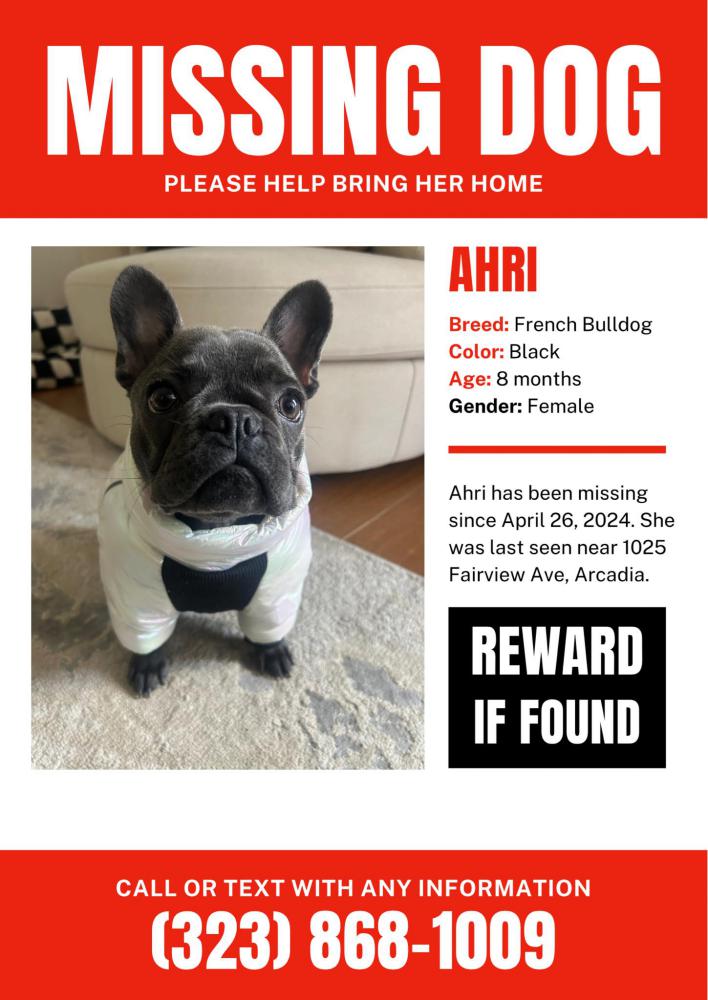Pet Description:8 month old female French Bulldog. Black short hair. Large reward if found. |