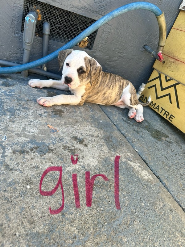 Pet Description:Mostly white with brindle (tan) accents and a black ring around her eye, white tip on tail. |