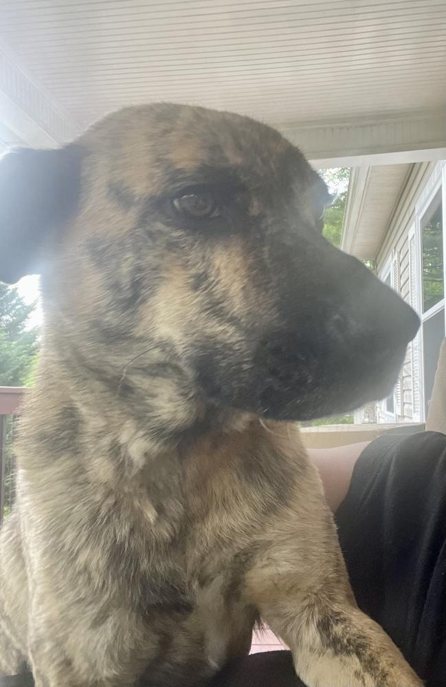 Pet Description:Young male shepherd mix. Brindle coat. Very friendly and sweet. Let me give him a bath. Can walk on a leash |