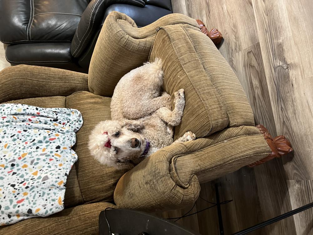 Pet Description:Cream colored standard poodle with a white spot on her chest |