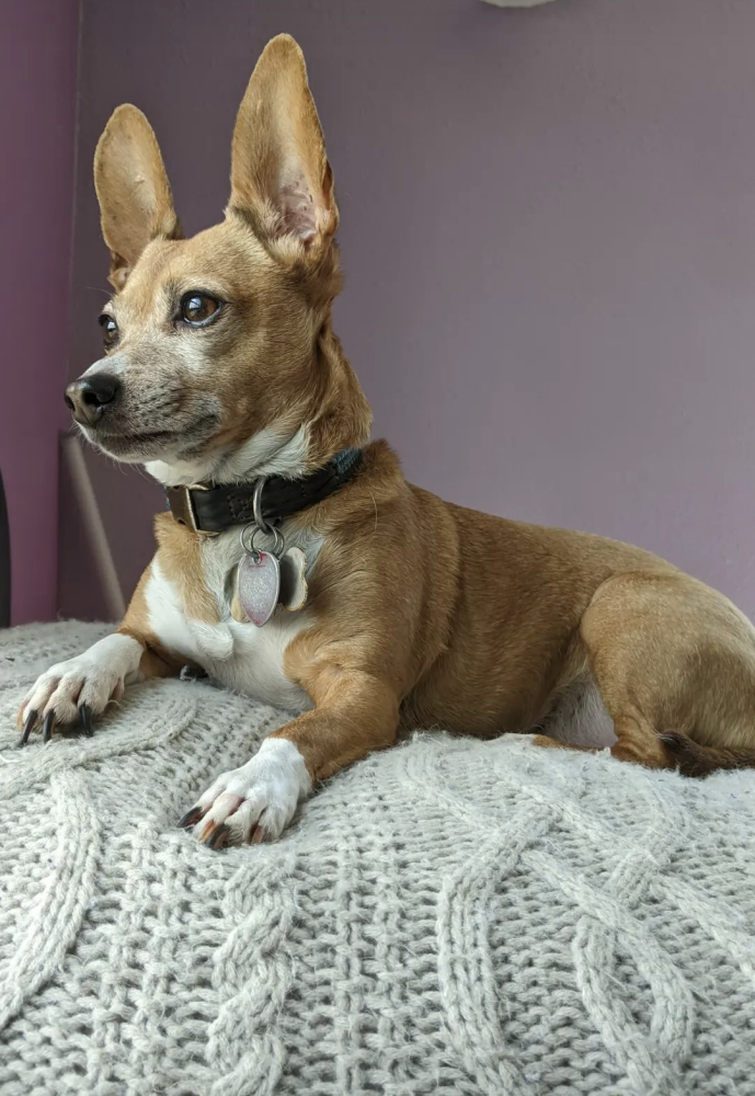Pet Description:10 lbs. Big ears. Wearing a blue collar. |