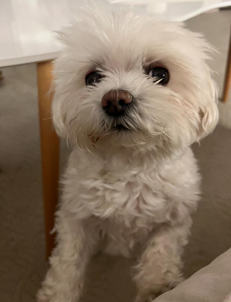 Pet Description:8 lb Maltese, all white, wearing black and blue collar with info |