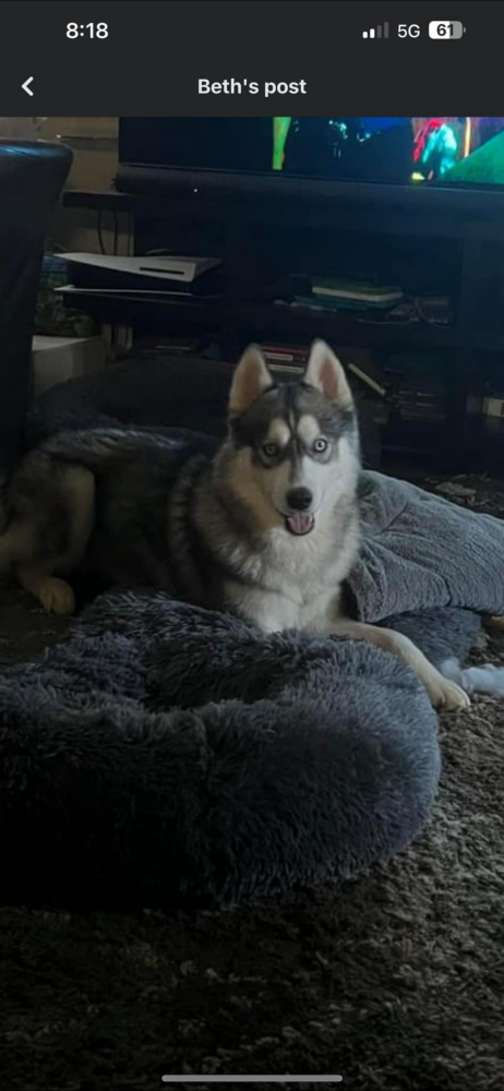 Pet Description:Gray, White and Black husky around 50 lbs. Has a black mask around the eyes |