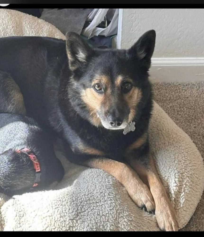 Pet Description:Pincher shepherd mix medium size older female red collar |