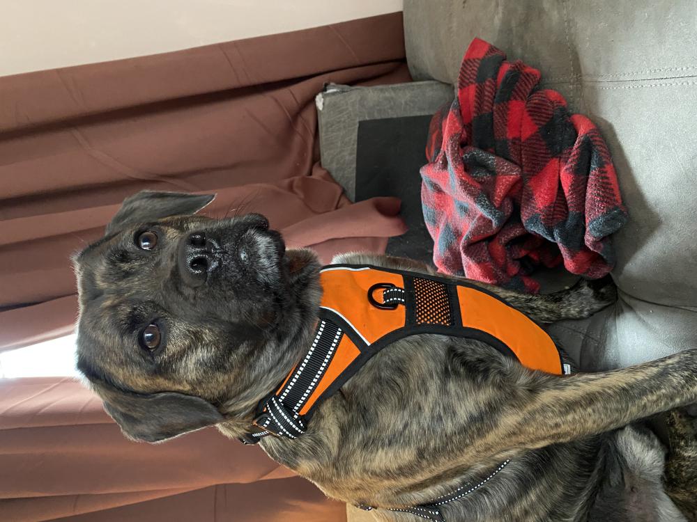 Pet Description:Medium chunky shirt haired brindle Pitt mix, longer ears and shorter black snout - touch of white on chest and chin - green collar with tractors and grey flea collar -very submissive, skittish |