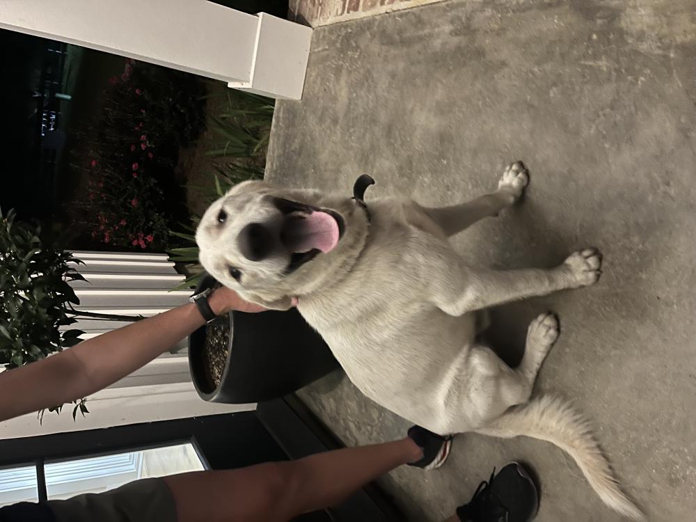 Pet Description:Large male white lab, intact, very friendly . Has his dew claws . Leather collar |