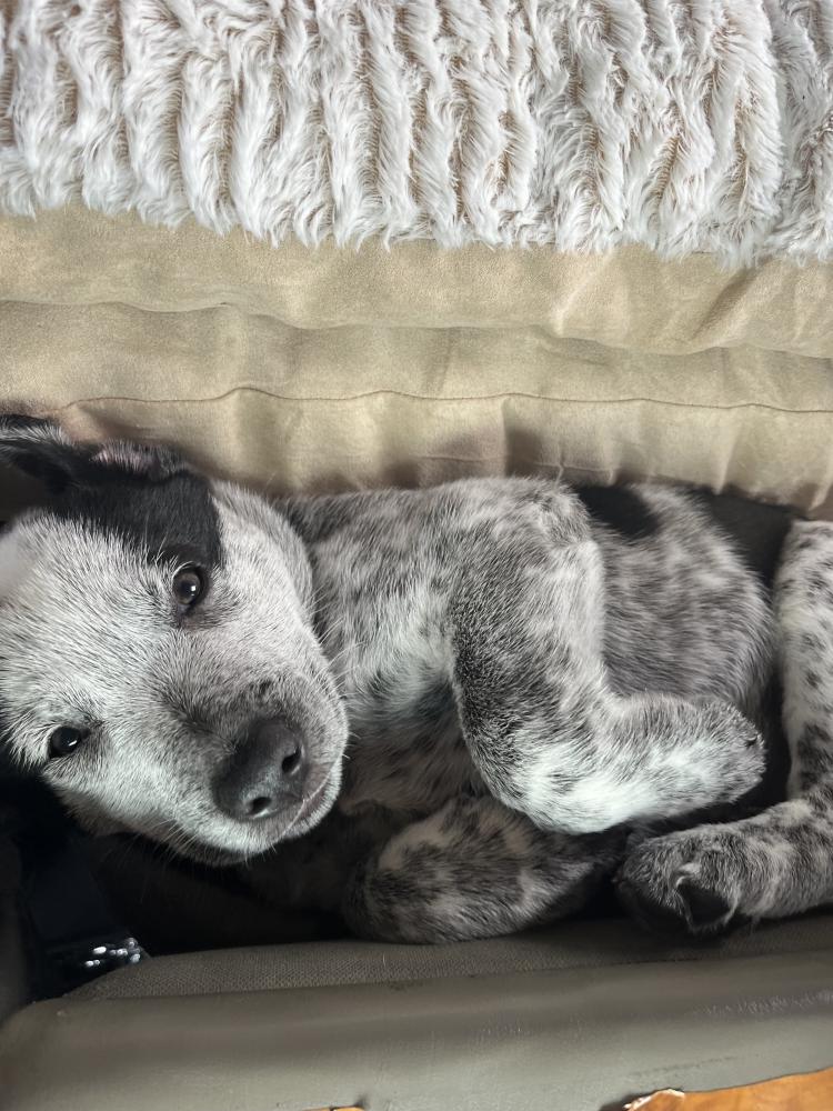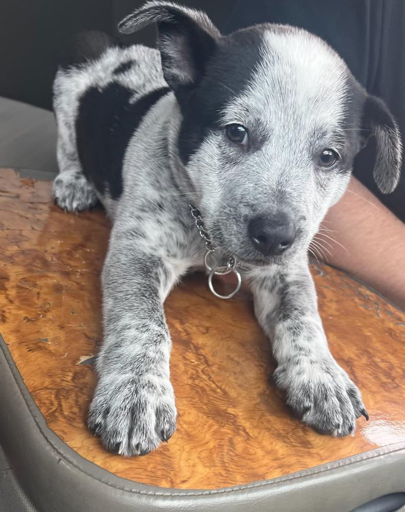 Pet Description:Texas heeler 3 months old Black ears , grey with a lot of black freckles and big black spots on back |