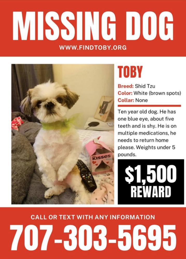 Pet Description:Toby is 10 years old, small shih tzu dog under 5 pounds. He’s on medication. It’s white with brown spots. |