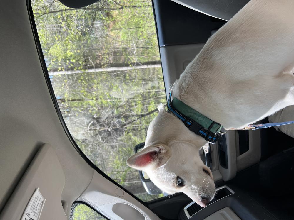 Pet Description:All white with big pointy ears and blue eyes half pit bull half husky |