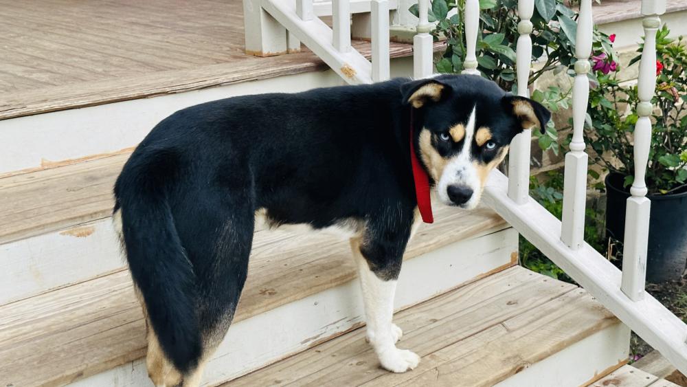 Pet Description:Female blue eyed mixed husky / shepherd. Had red shock collar on but battery had died and she escaped at night. Very friendly. Had ear infections and needs medicines. Can show you pictures of her from pup. |