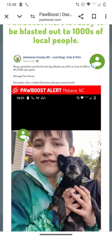 Pet Description:black chihuahua with gray around her mouth, her nipples are big like how a momma dogs would be. |