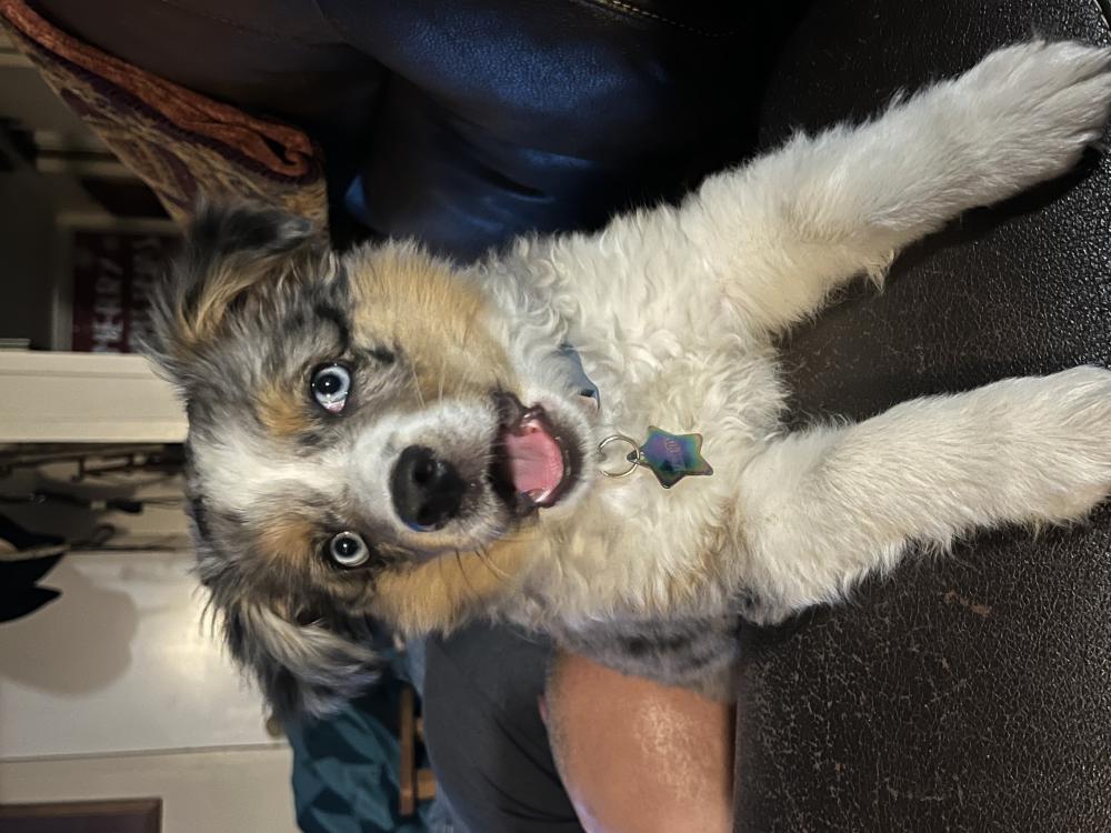 Pet Description:Toy Aussie, Blue Merle, a few months old, one ear flops lower than the other. |