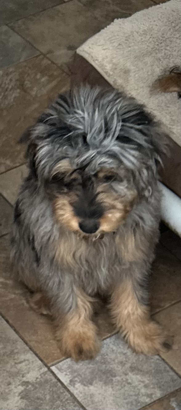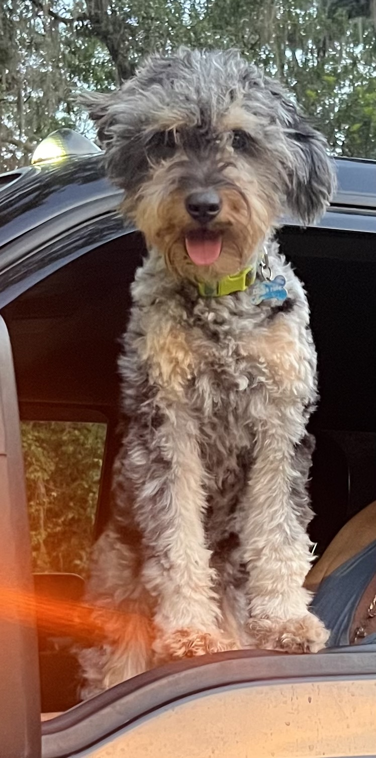 Pet Description:Aussiedoodle weighing 22 lbs. He's white, black, brown and tan. He's only 1.5 years old and hops like a rabbit when he runs. |