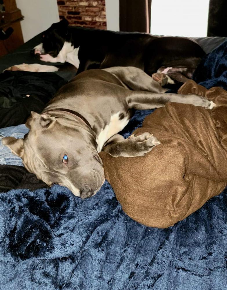 Pet Description:He's a blue pit with a short stubby snout a white goatee that goes down into his chest. He's got a bump on his tail midway answers to the name of Herky. He also has a distinct white marking on his nose. When he sits down he favors his back left leg. |