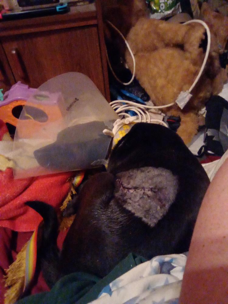 Pet Description:!! SHE JUST HAD HER STITCHES REMOVED AND NEEDS HER MEDS!! Dark Chocolate Brindle that appears black. White areas on chest & toes. Shaven side with giant scar. Responds to her name, is friendly but skittish so she will bark! She is food motivated. |