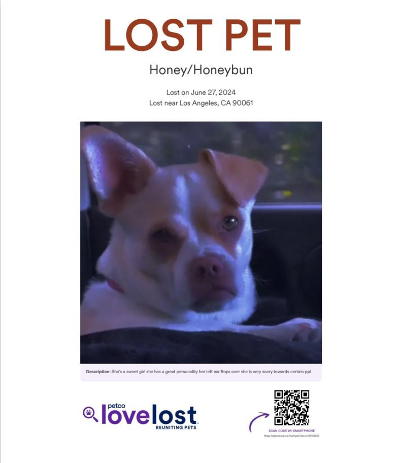 Pet Description:She's a chihuahua mixed with English bulldog Her left ear is Always down she had a pink collar lv like symbols on collar she a small medium dog short hair tan cream mixed white coat PLEASE BRING HER HOME!!ยก! |