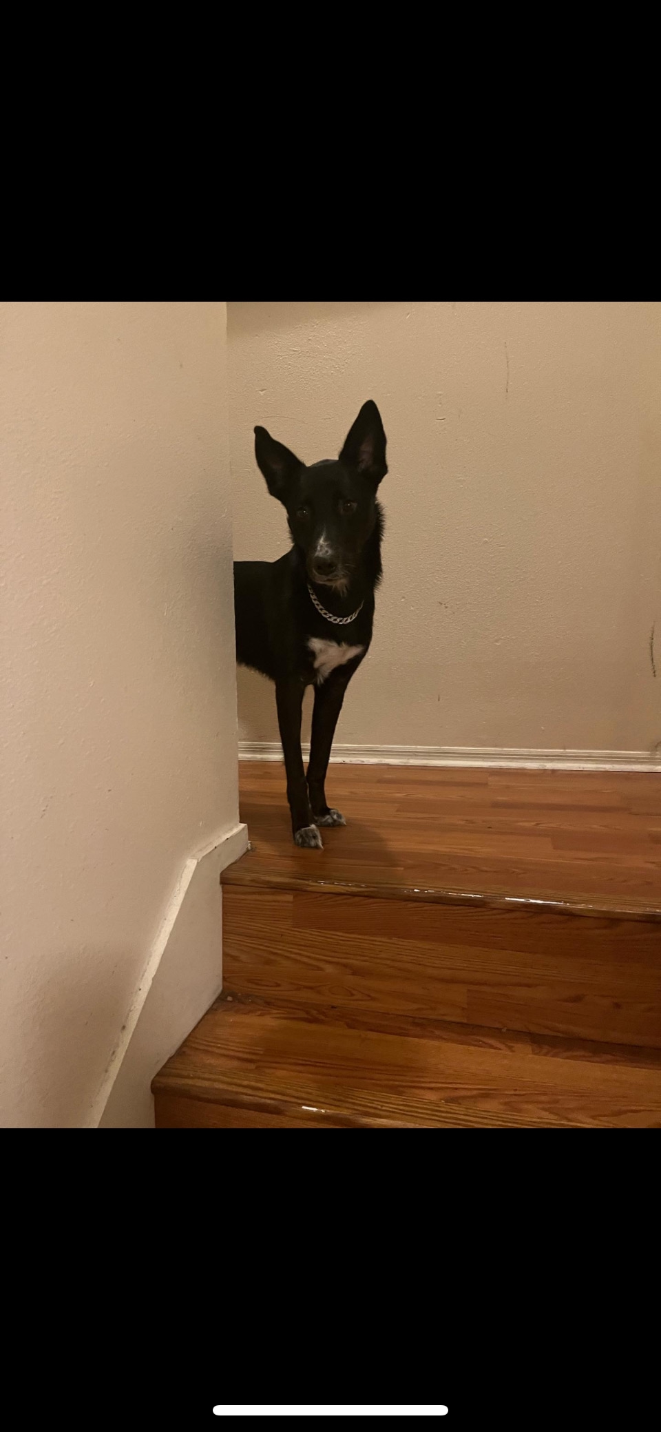 Pet Description:Black lab retriever with white chest and white paws |