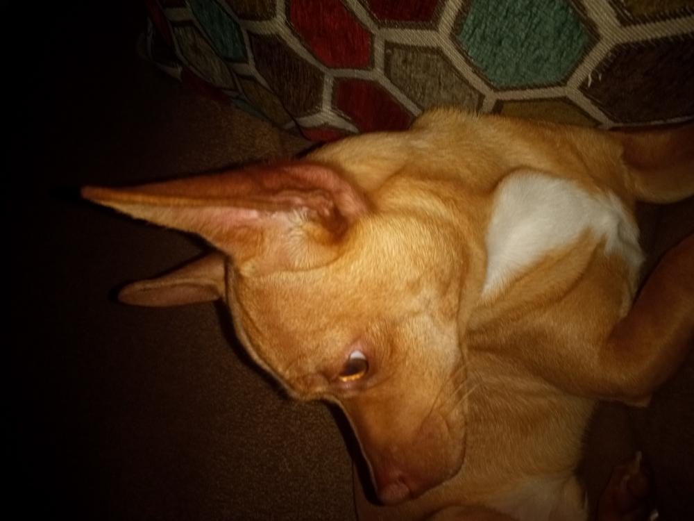 Pet Description:A light brown Chihuahua with green eyes and white on his neck |
