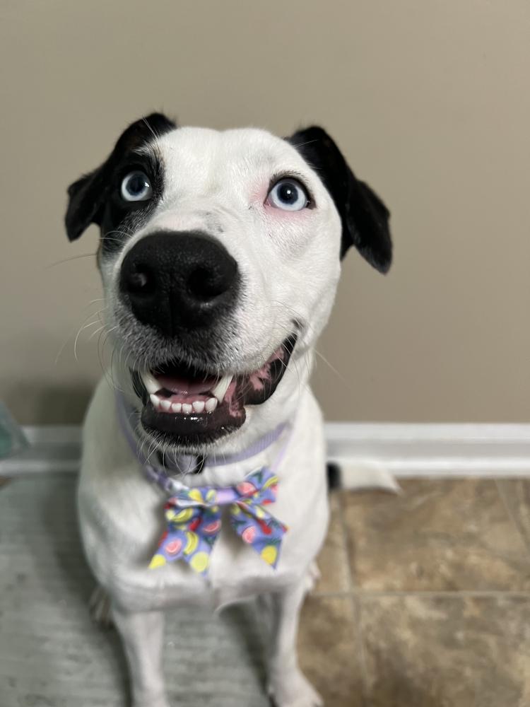 Pet Description:white short haired, with brown and black spots, blue eyes |