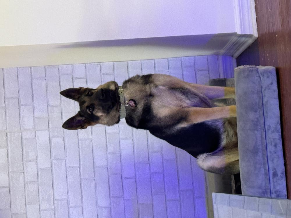 Pet Description:She is wearing a green collar, she is mostly blacj with a lighter tan belly. She may still have her blue bandana on. |