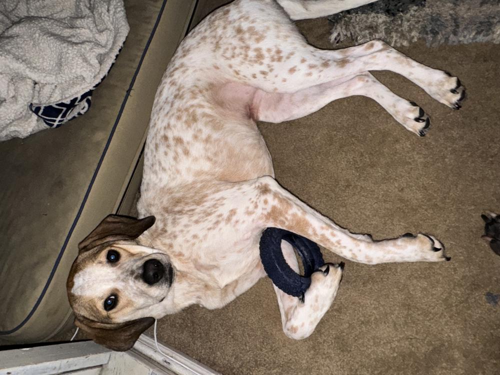 Pet Description:She is a medium sized dog, roughly 50 pounds. white with brown spots. extremely friendly and full of energy. Has on a blue collar |