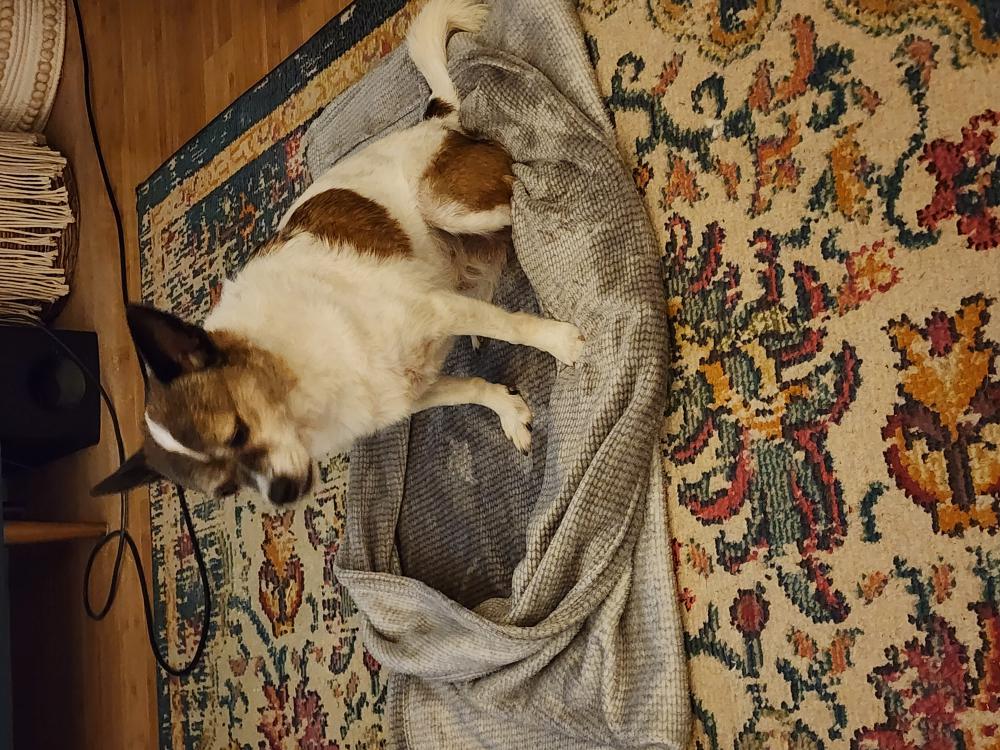 Pet Description:Brown, white feist mix with black ears. She's approximately 16 lbs. No chip. |