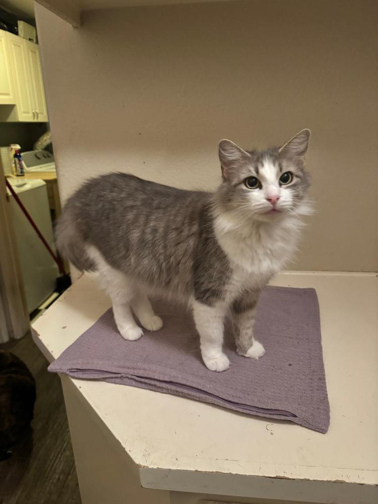 Pet Description:Luna is grey and white with yellow/green eyes. Shes only around 7 pounds and she has medium length fur. She is very shy as well. |
