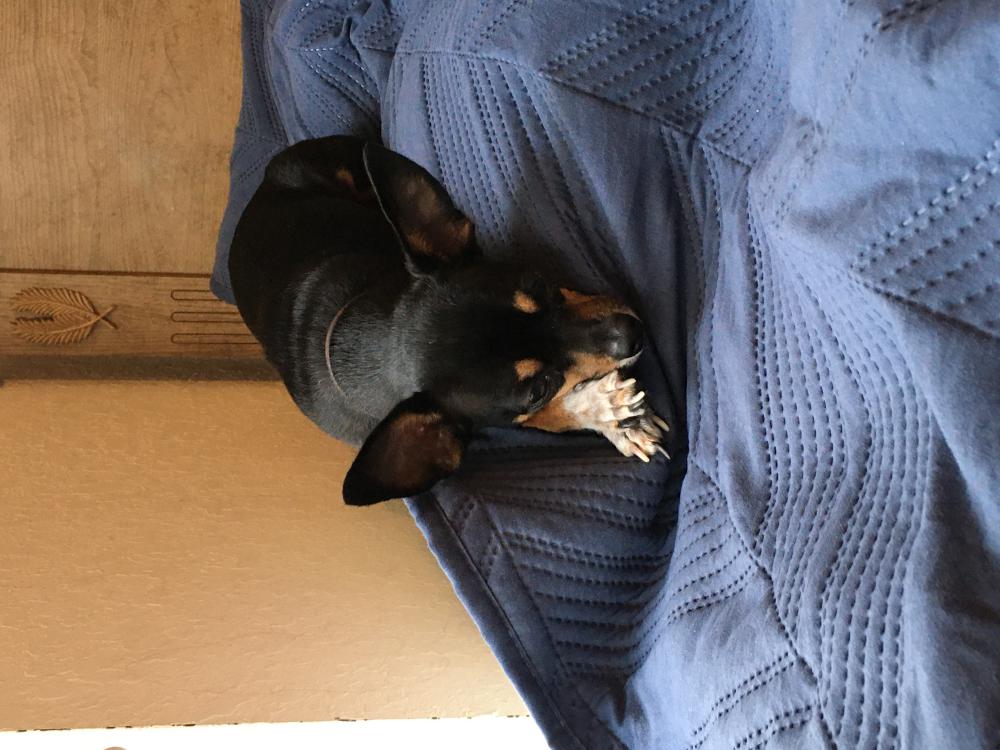 Pet Description:Black fur with brown accents and a white tummy, has brown eyebrows and white paws, studded leather collar with a purple heart tag. |