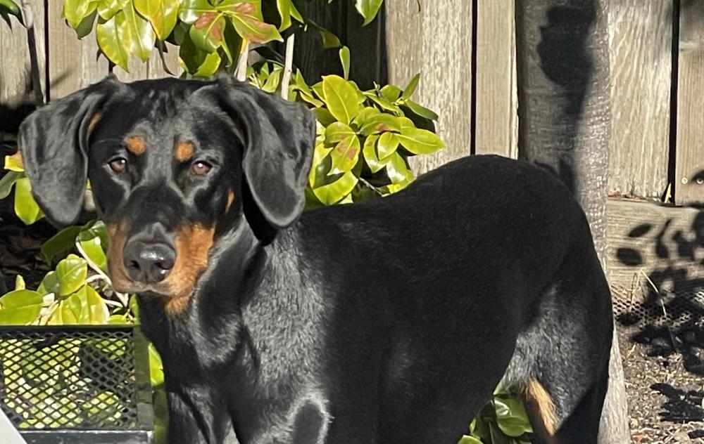 Pet Description:Black and tan doberman with floppy ears, wearing a brown leather collar. She is shy, but very sweet, her name is Love. |