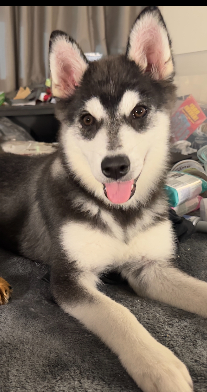 Pet Description:Small to medium size honey colored eyes wearing a green harness |