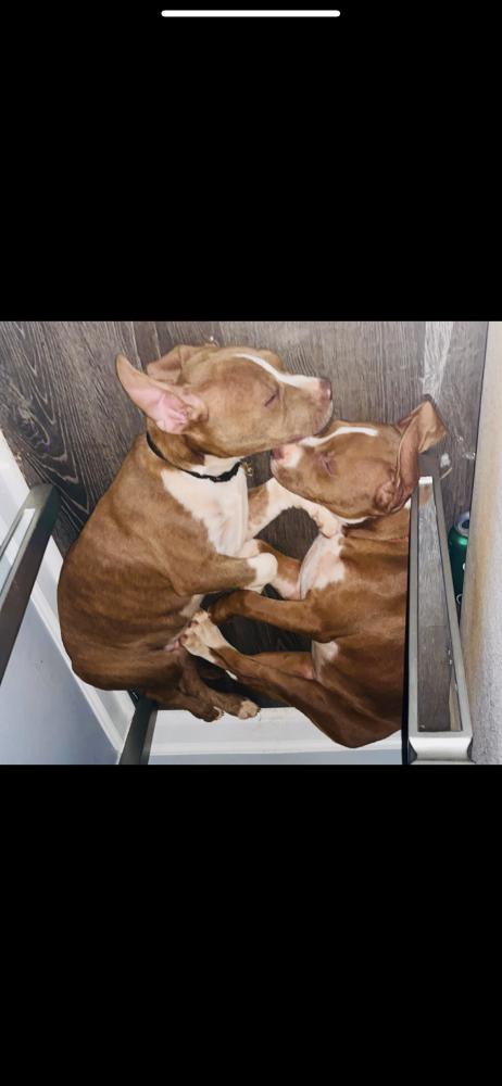 Pet Description:Twin puppies Breed Pitbull mix with Sharpei Jasper the boy has no collar he had recently removed itBellamy the girl has a purple unicorn collar They are 4 months old light brown & white with a white streak going down the middle of their forehead all the way down to their nose, the top of them all brown, the bottom of them are all white. They are very sweet loving playful babies, they are pretty much inseparable always togetherDue to their age i have not taken them of my property much so i don't |