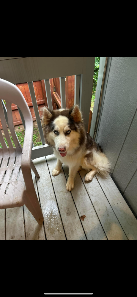Pet Description:He has a blue harness on and a scratch on his nose |
