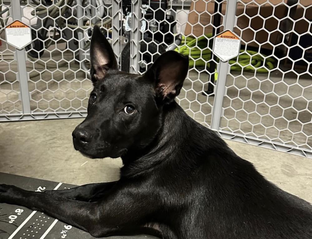 Pet Description:Medium size dog, black, maybe pitbull and lab mixture |