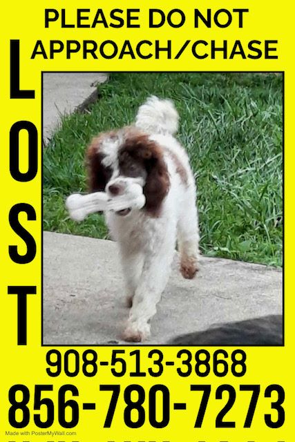 Pet Description:White poodle mix with brown spots wearing a light purple harness, dog is a rescue/foster and scared but non-aggressive and chipped |