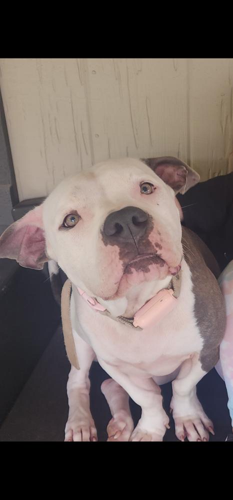 Pet Description:White with brindle gray spotsPlease bring coco home, microchipped and spayed, small green tattoo on her under belly. |