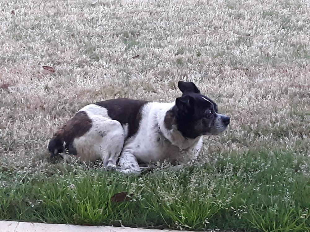 Pet Description:20lb white & brindle Boston terrier and rat terrier mix. Almost 15 years old with white hair around her eyes and muzzle. |