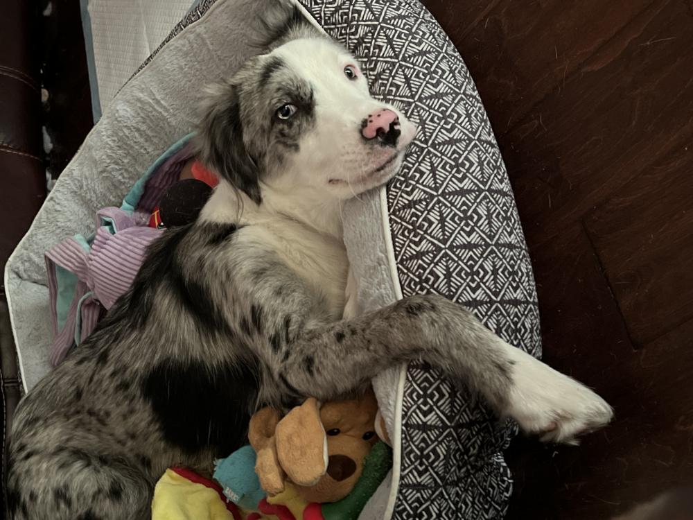 Pet Description:Curr Aussie mix with blue eyes and pink collar. White, black and grey. Very friendly. |