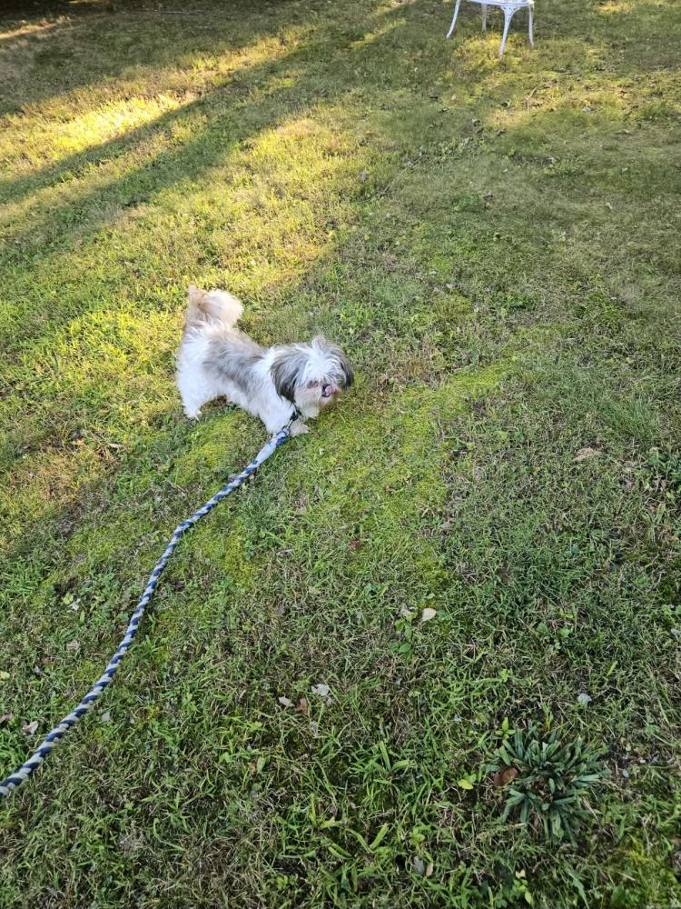 Pet Description:He is a male shitzu with a blue rope leash attached to him. He’s 14 years old and doesn’t really listen, but he’ll come to you if you have food. He’s also pretty slow. |