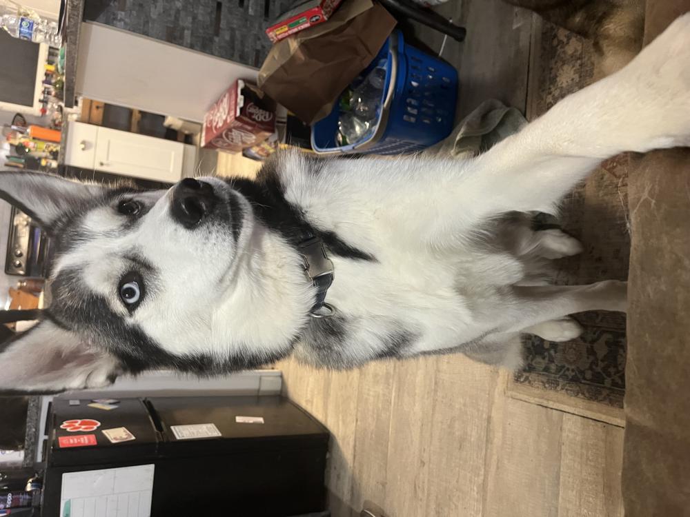 Pet Description:Black and white husky in a blue tie dye collar. One blue eye and one brown eye (the brown eye has a bit of blue at the bottom) |