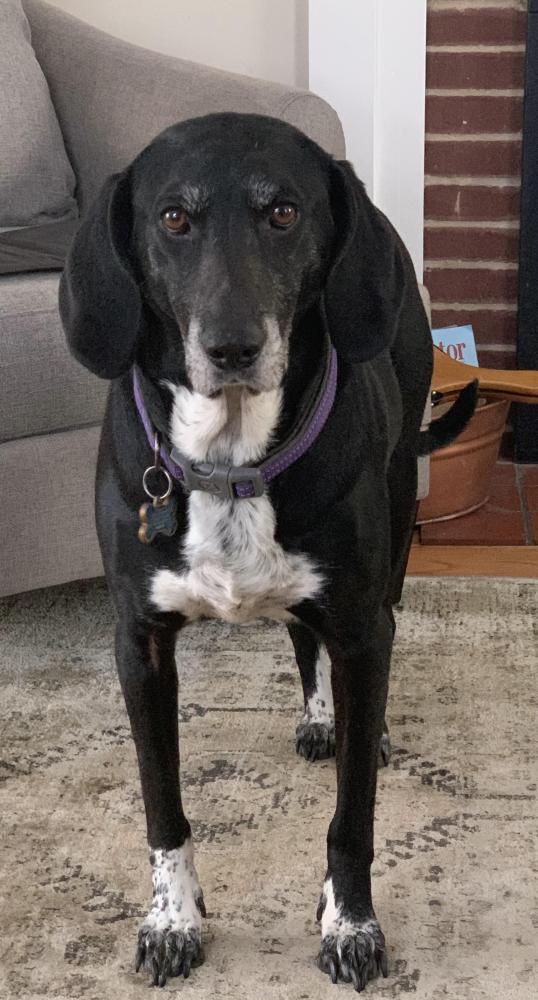 Pet Description:Black and white hound mix with white feet. Very friendly and will come up to strangers. |